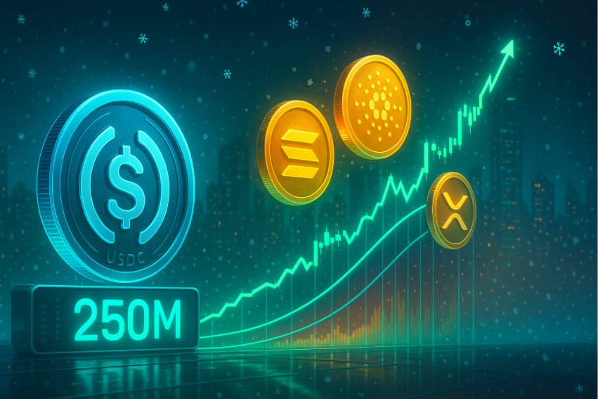 De cryptomarkt kreeg vandaag een stevige prikkel: er is ongeveer $250M USDC gemint. Op papier ziet dat eruit als een droge on chain statistiek, maar veel traders lezen het als signaal dat er verse munitie klaarligt voor een mogelijke eindejaarsrally in Solana, Cardano en XRP.