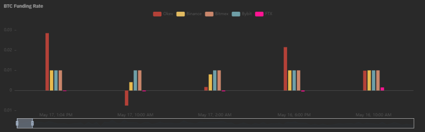As reported by NewsBTC, one leading crypto chartist recently shared the data below, indicating that the funding rate of the Bitcoin futures contracts on OKEx — funding being the fee that long positions pay short positions — has “suddenly [trended] very high again.”