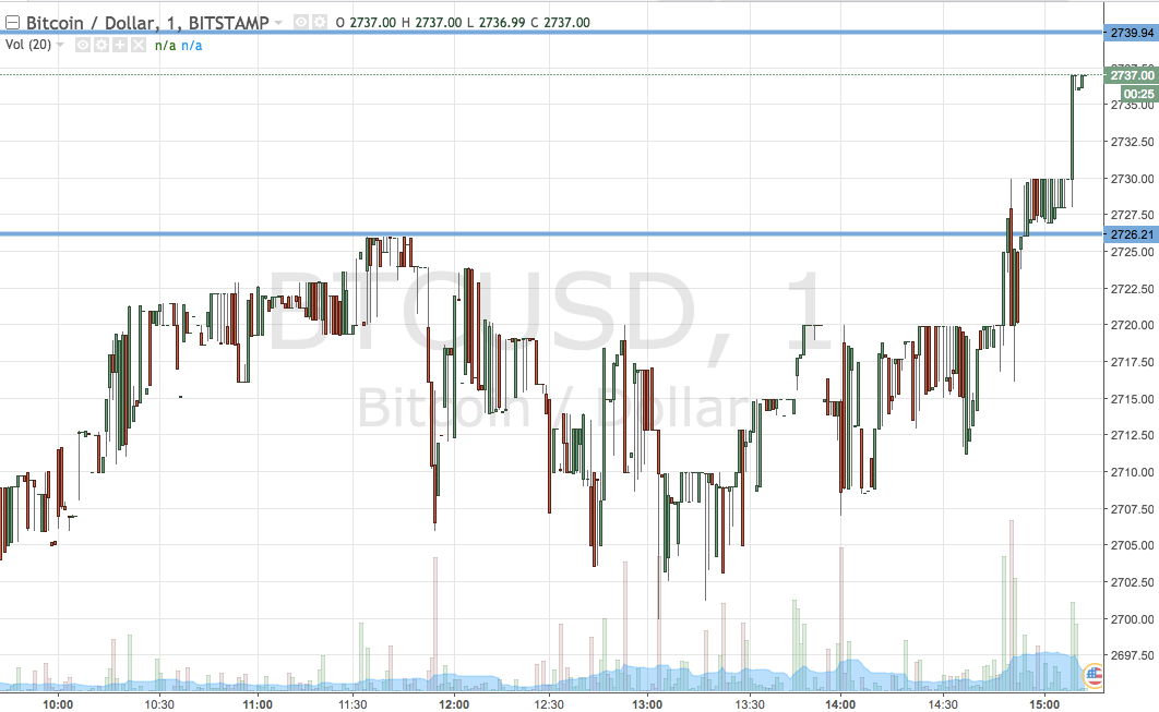 As the chart shows, the range we are looking at for the session this evening, and the levels with which we are looking to act upon our potential near time entry, are 2726 to the downside serving as support and 2739 to the upside serving as resistance. This is a slightly narrower range than we have used recently but this is purposeful – it allows us to jump into the market quickly if we get the break we are looking for.