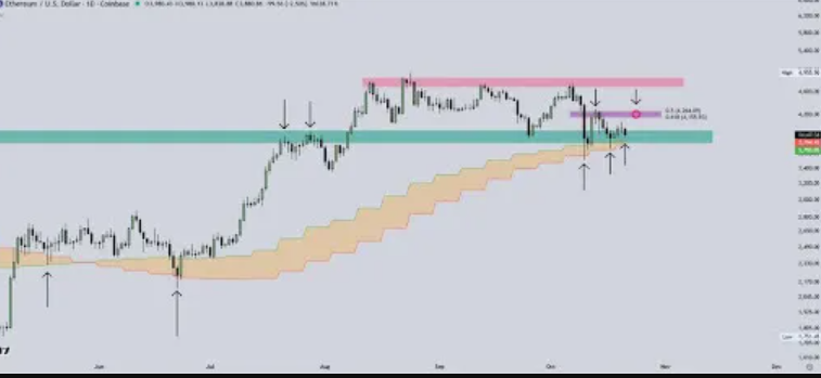 L’analista Luca ha osservato che il prezzo di ETH continua a consolidarsi nella fascia di supporto a lungo termine (in verde), che nel 2024 aveva agito da forte resistenza, limitando diversi massimi locali.