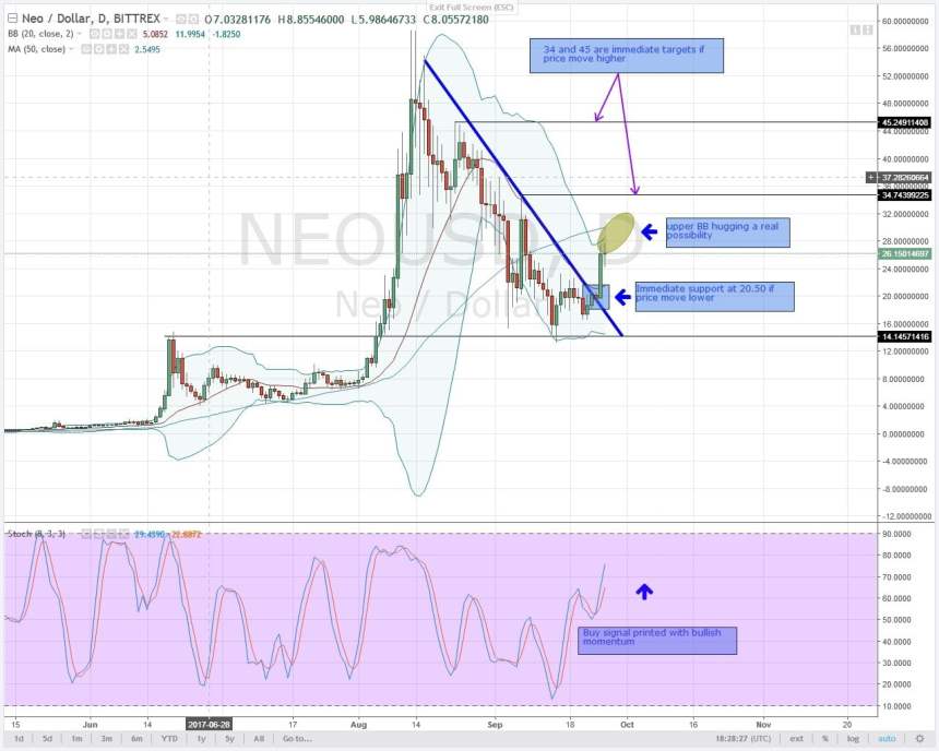 Yesterday’s candlestick closed as a doji in the sense that there was clear buying pressure after that long lower wick. Even though price swings were limited to 3.00 points in contrast to Monday’s 8.00(Hi-Lo 17, 18), the price is on course of moving higher. I will expect more bullish momentum especially if there is upper BB hugging as price diverge further away from the lower BB. Going forward, the 50-period Ma and the major resistance trend line will be our region of support at around 20.50. Bulls will target the first level of resistance at 34.00 as long as stochastics buy signal remains. Refer Figure 1: NEOUSD-Daily Chart-27.09.2017 (above).