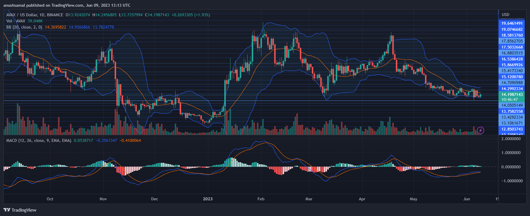 As of the time of writing, AVAX was trading at $13.90. The coin faces an overhead resistance at $14, and if it manages to surpass this level, it is likely to encounter strong resistance at $14.20.