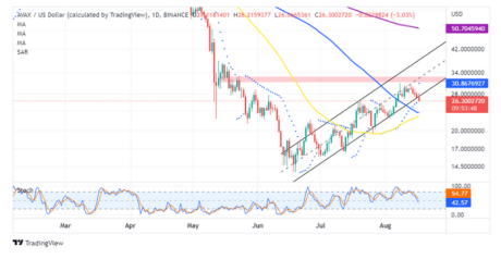Even though AVAX was able to break above $30, the coin wasn’t able to fill in the cracks to $40. At first, support seen at $28 controlled the bears’ grasp on the price but AVAX price retraced at $26.22 and is in danger of plunging further down to $25 and $21.