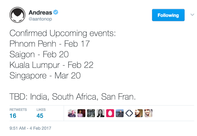 Antonopoulos has scheduled a Southeast Asia tour starting February 17, 2017. The tour will begin with a speech at the TRYBE Workspace in Phnom Penh, Cambodia. The event is being organized by Coin Cafe, a unique Bitcoin-themed restaurant in the city. According to his recent tweet, the Phnom Penh event will be followed by another meetup in Saigon, Vietnam on February 20, then Kuala Lumpur on February 22 and one more in Singapore on March 20.