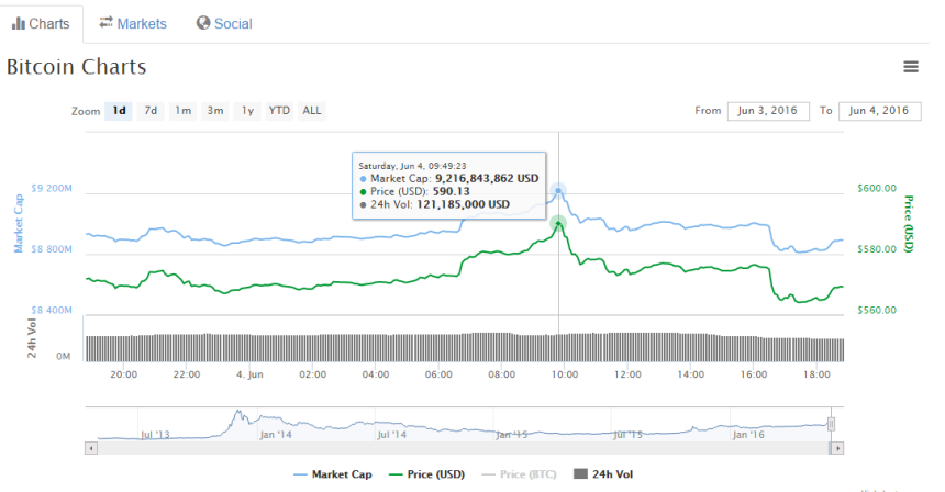 The Bitcoin network crossed another milestone earlier today. Thanks to the strong bitcoin trading in the past few weeks, the value of the digital currency has almost reached $600 mark. Simultaneously, keeping up with the increasing bitcoin price, the total market capitalization of the digital currency today crossed $9 billion.