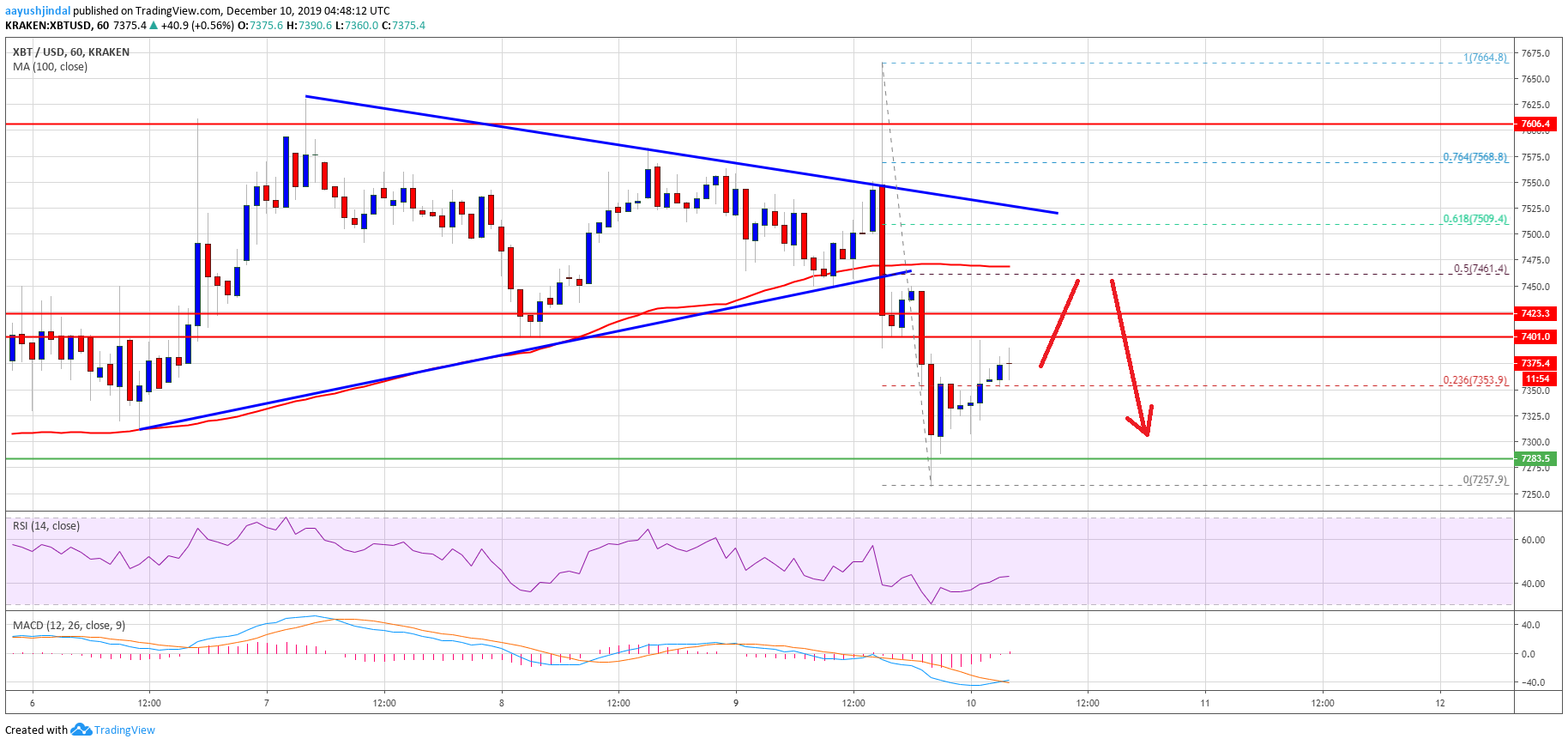 Additionally, the 50% Fib retracement level of the recent decline from the $7,664 high to $7,257 low is near the $7,460 level to act as a resistance. There is also a key bearish trend line forming with resistance near $7,525 on the same chart.