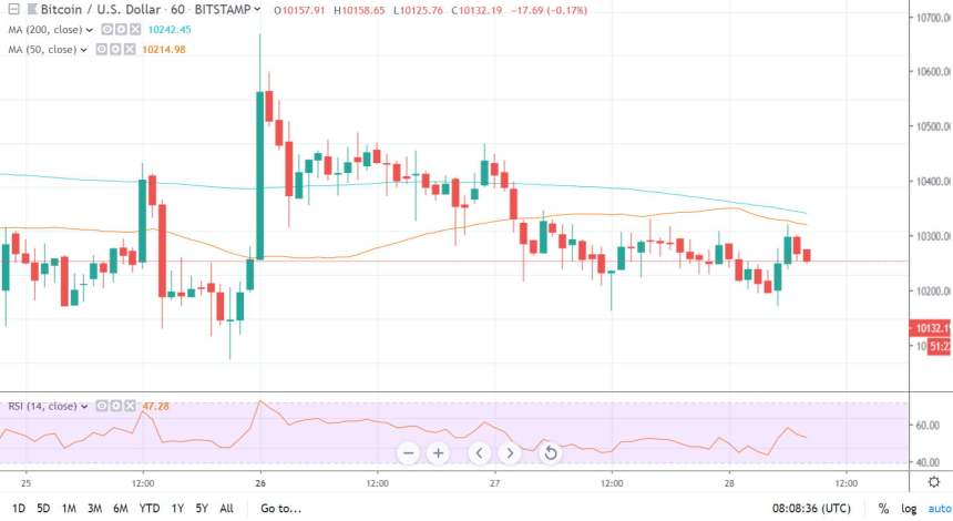 Over the past 24 hours BTC has traded between $10k and $10.2k in a very tight channel. Since its Monday spike, Bitcoin has slowly slid back towards the psychological $10k barrier but as yet has not fallen through it according to Tradingview.com. Daily volume has tailed off as the week has progressed and is now at around $13 billion.