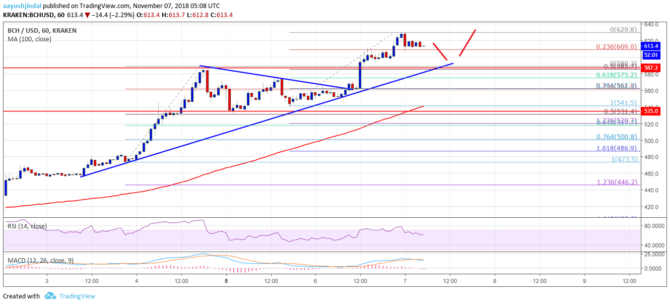 Bitcoin cash price is placed heavily in an uptrend above $550 against the US Dollar. BCH/USD traded as high as $629 before it started a downside correction.