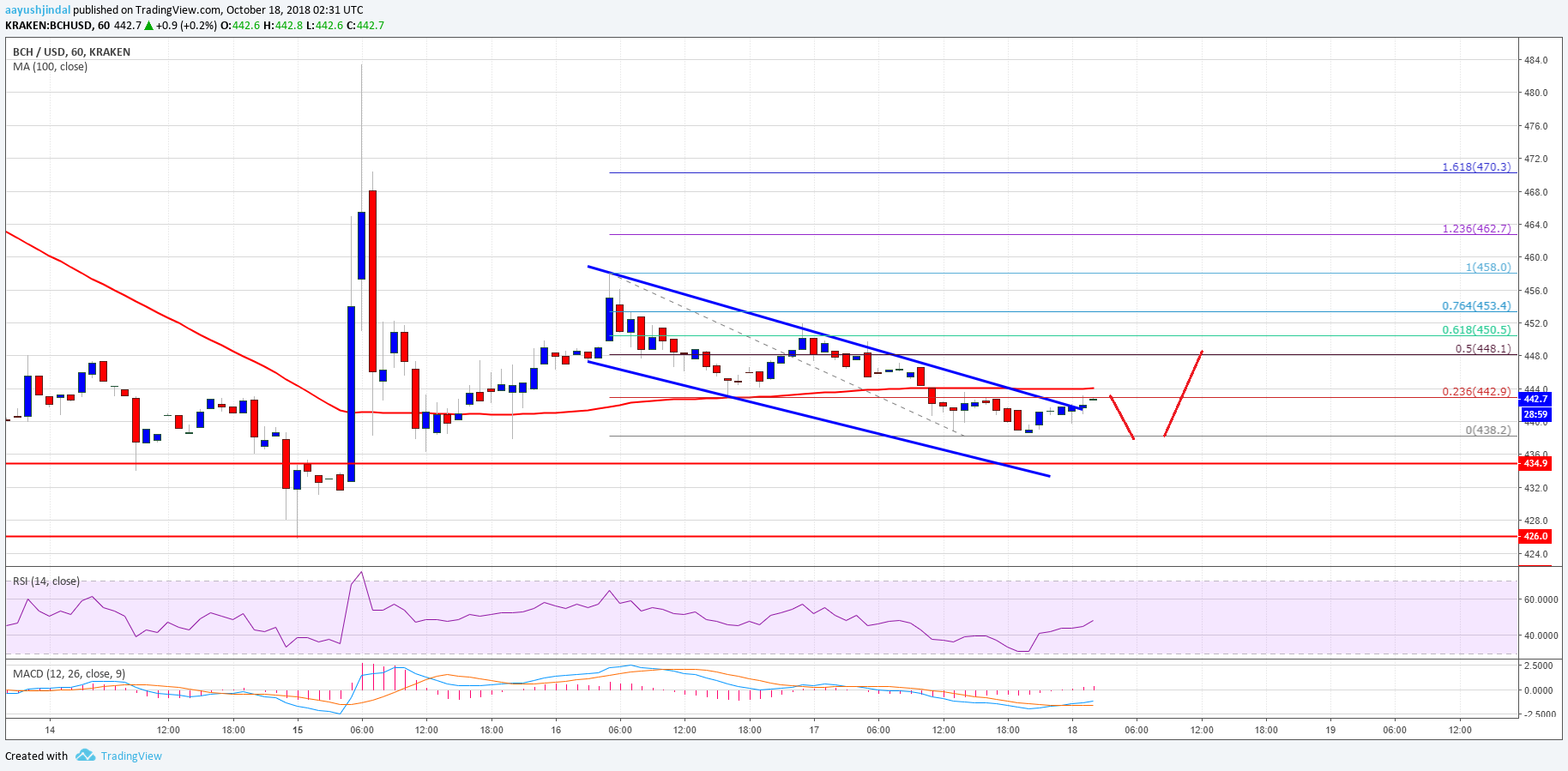 It has moved back above the $440 level with a few positive signs. Moreover, there was a break above a short-term declining channel with resistance at $441 on the hourly chart of the BCH/USD pair. The pair is currently testing the 23.6% Fib retracement level of the recent slide from the $458 high to $438 low. More importantly, the 100 hourly SMA is positioned near the $444 level. Therefore, a proper break above the $444 level and the 100 hourly SMA is needed of an upside push. The next resistance is near the 50% Fib retracement level of the recent slide from the $458 high to $438 low at $448.