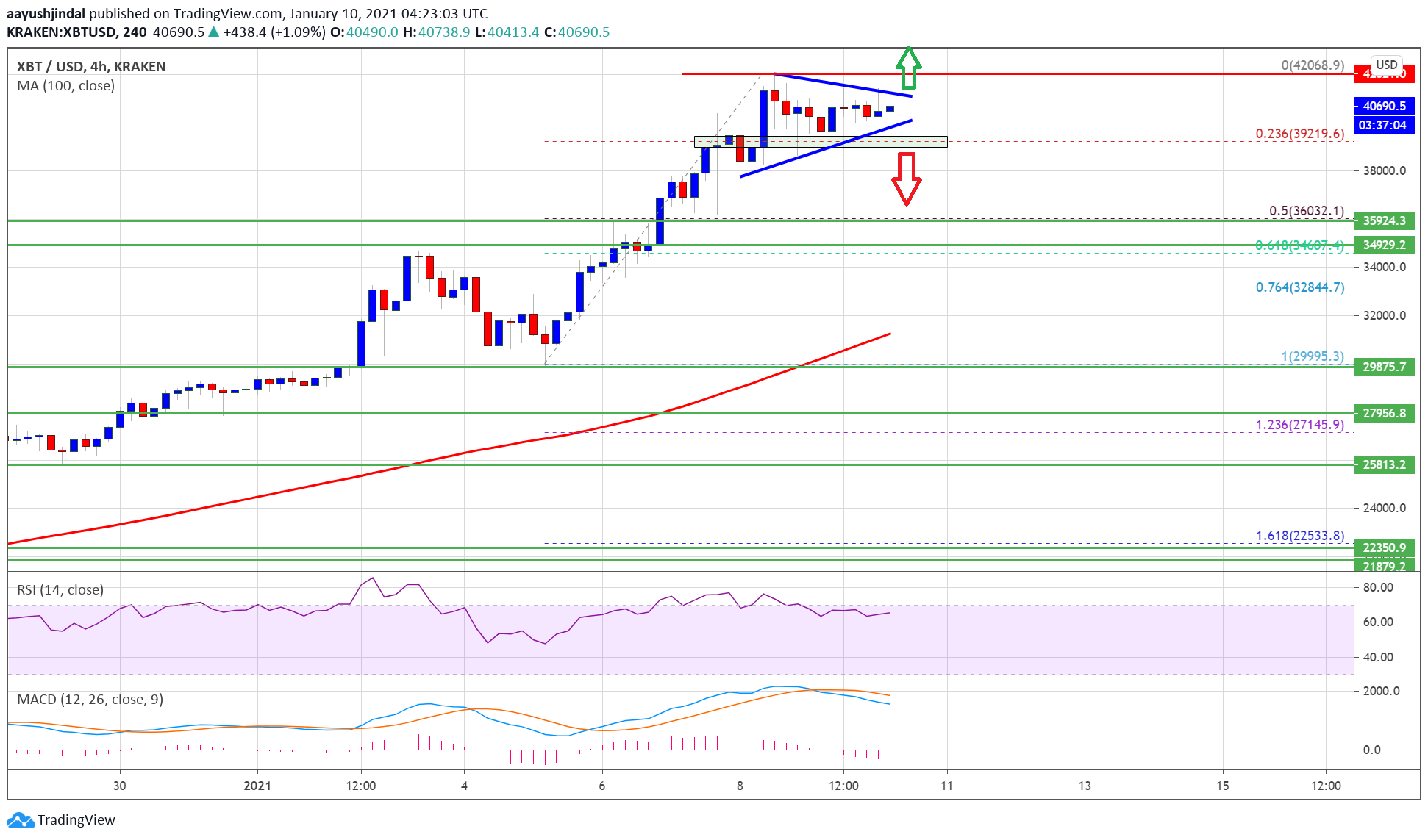 It even surged above the $40,000 level and settled well above the 100 simple moving average (4-hours). Bitcoin traded to a new all-time high at $42,068 before it started consolidating gains. There was a minor decline below $41,000 level.