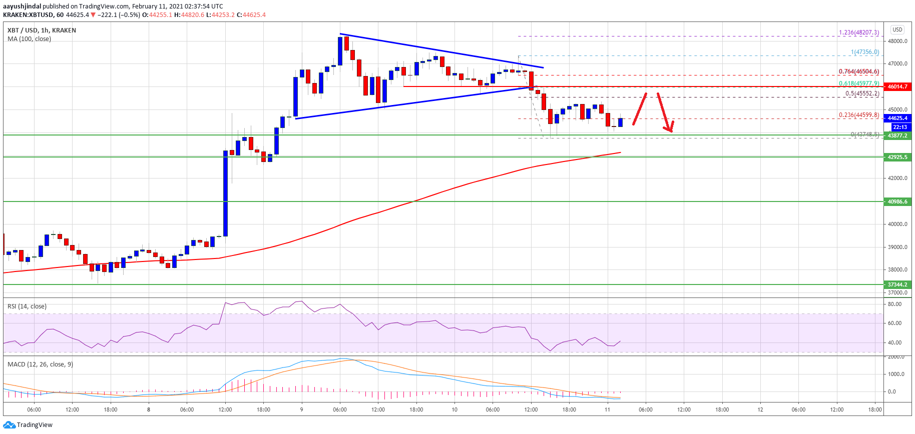 There was also a break below a key contracting triangle pattern with support near $46,000 on the hourly chart of the BTC/USD pair. The pair even traded below the $45,000 and $44,450 levels. A low is formed near $43,748 and the price is currently consolidating losses.