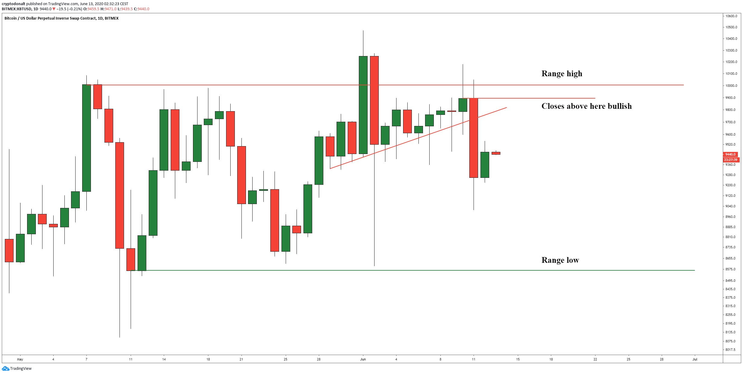 At the time of writing, Bitcoin is trading up nominally at its current price of $9,460. It has been hovering around this price level for the past couple of days, and each attempt to rally or plunge has been quickly halted by the opposing side.