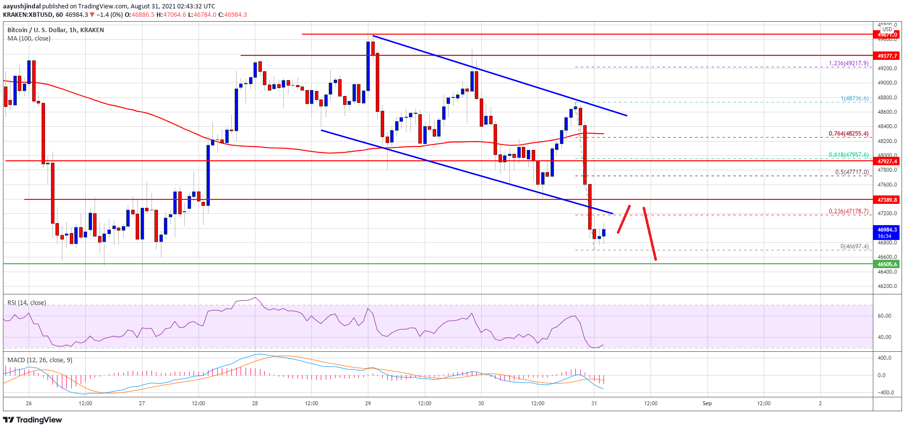 There was also a break below a key declining channel with support near $47,500 on the hourly chart of the BTC/USD pair. The pair is now trading well below $48,000 and the 100 hourly simple moving average. It tested the $46,700 zone and it currently consolidating losses.