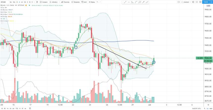 At the time of writing, Bitcoin is trading up over 1% at its current price of $9,240. This marks a notable climb from daily lows of $9,100, and it does appear that buyers are trying to generate some upwards momentum.