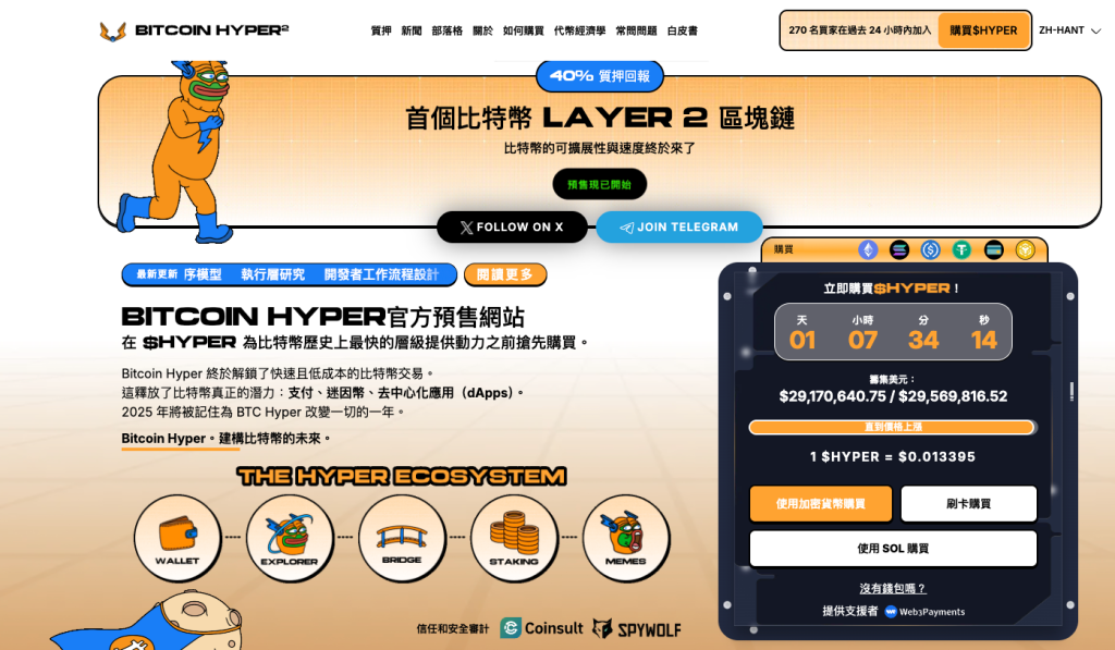 Bitcoin Hyper 主打「THE FIRST EVER BITCOIN LAYER 2」,結合比特幣的安全性與 Solana Virtual Machine(SVM)的高效執行環境。對一般使用者來說,重點不在技術名詞,而是實際體感:交易確認更快、費用更低,而且終於可以在比特幣之上使用智慧合約與 DeFi。