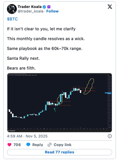 近期的走勢也印證了一些技術派分析師(例如 X 平臺上的 Trader Koala)的觀點:當前 BTC 處在一個類似 2023–2024 年那段盤整後的區間震盪結構中,後面一旦選擇方向,可能再次迎來趨勢性突破。