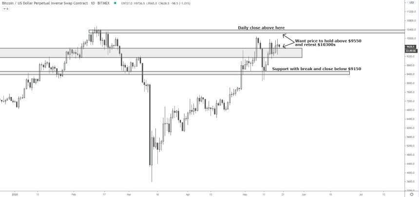 “Nice close by Bitcoin, bounced off support and holding $9550s on higher time frames. For me to feel bullish, want to see a break and close above $10300s from here. Break support at $9150 and we had back down to mid $8ks,” he explained.