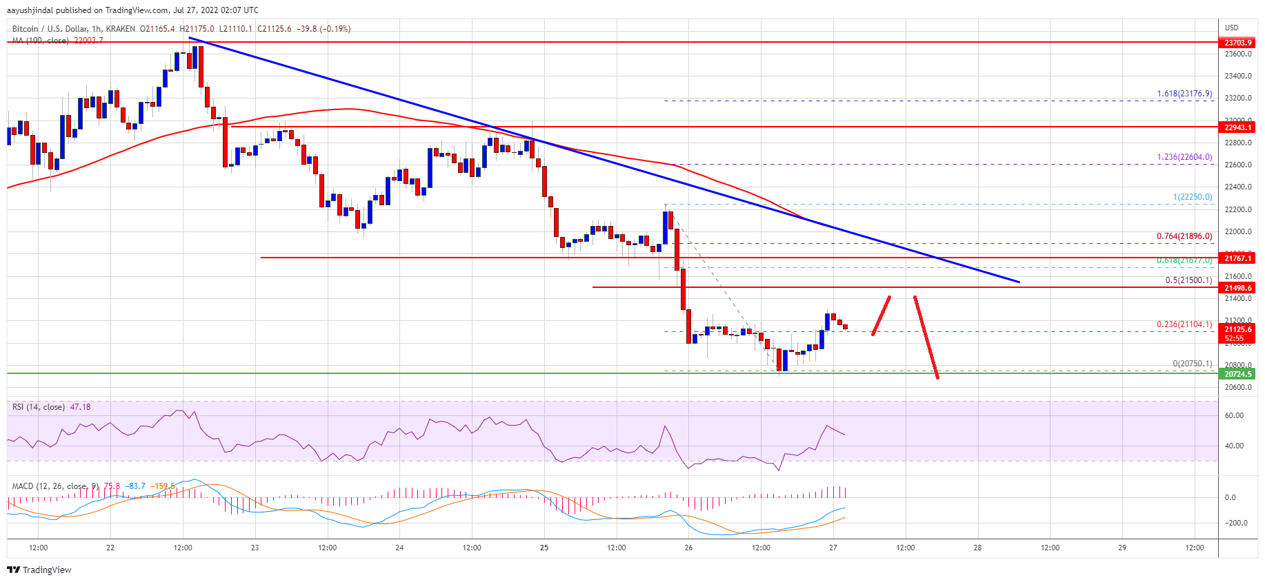 The next major support now sits near the $20,750 and $20,500 levels. A close below the $20,500 support zone might increase selling pressure and the price might test $20,000 in the near term.