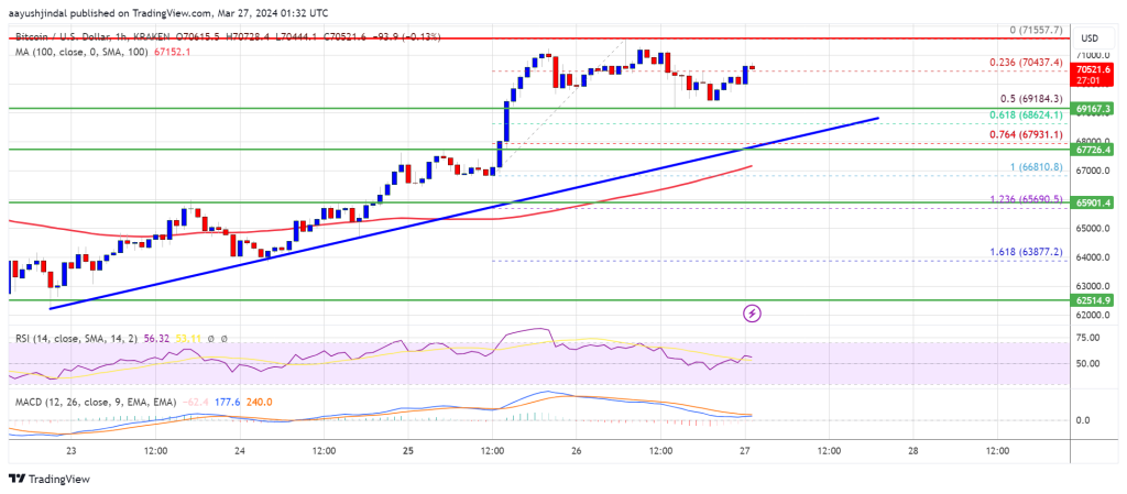 A new weekly high was formed near $71,557 and the price is now consolidating gains. There was a minor decline below the 23.6% Fib retracement level of the upward move from the $66,811 swing low to the $71,557 high. However, the price remained stable above $69,000.