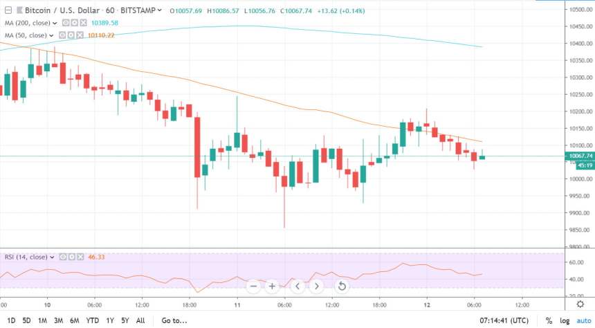 The daily outlook for BTC is as uneventful as it has been for the past week or two. The range bound trading has continued within an ever tightening channel and a break out appears to be imminent. According to Tradingview.com Bitcoin briefly touched $10,200 yesterday but has fallen back since.