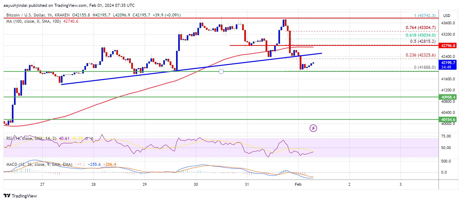- The price is trading below $42,800 and the 100 hourly Simple moving average.