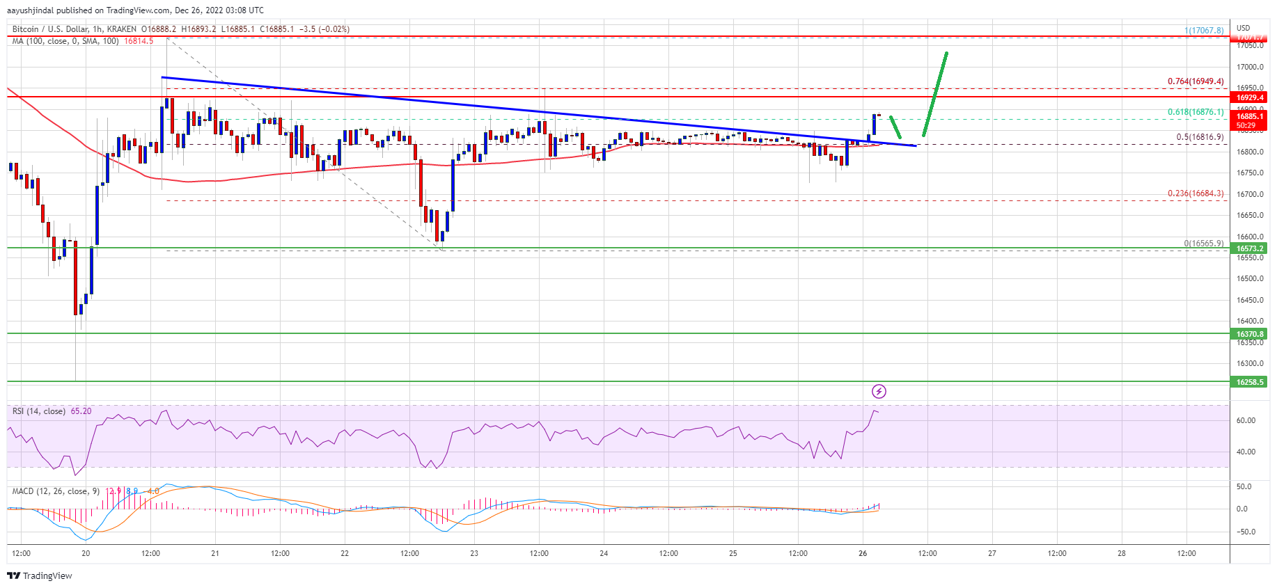 - The price is trading above $16,800 and the 100 hourly simple moving average.