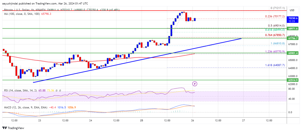 A new weekly high was formed near $71,217 and the price is now consolidating gains. It is trading near the 23.6% Fib retracement level of the upward move from the $66,810 swing low to the $71,217 high. Bitcoin is also trading above $70,000 and the 100 hourly Simple moving average.