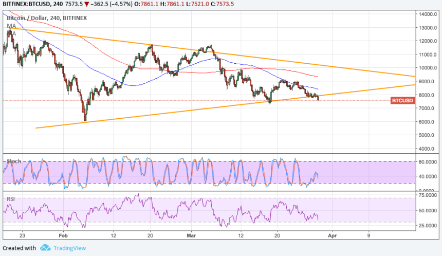 - Bitcoin price is starting to breach support of its symmetrical triangle to signal that a downtrend is underway.