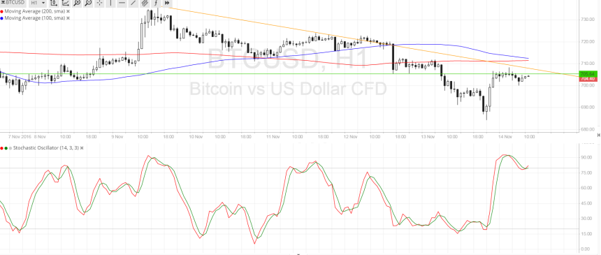 Also, the moving averages line up with the descending trend line connecting the highs of bitcoin price action since November 9, adding to its strength as a potential ceiling around $705-710. A move past this area could put bitcoin back in its longer-term climb.