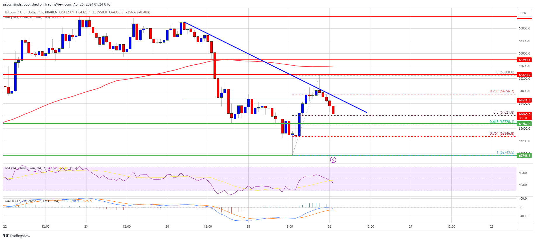 Bitcoin price started a recovery wave from the $62,750 support zone. BTC was able to climb above the $64,000 and $64,500 resistance levels. However, the price failed to clear the $65,500 resistance zone.