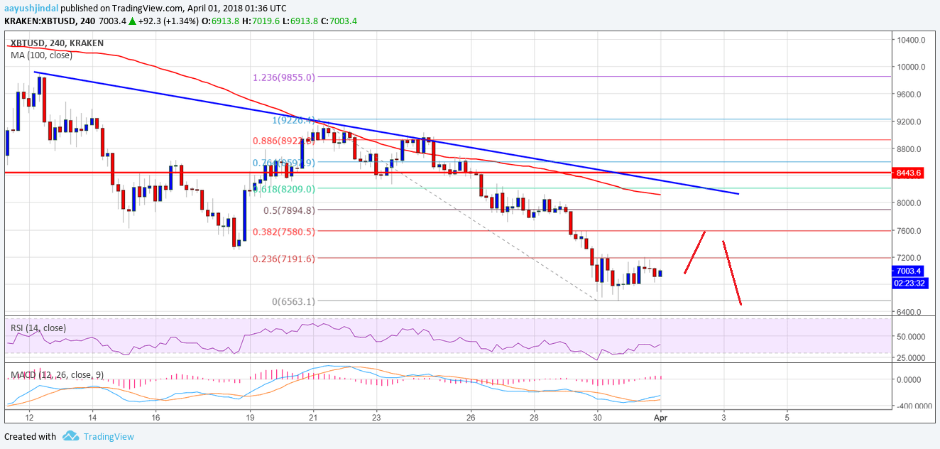There was a major decline this past week from well above $9,000 in bitcoin price against the US Dollar. The price tumbled and declined below many important support levels such as $8,000 and $7,000. It even traded close to the $6,500 level. A low was formed at $6,563 before it found bids. A minor upside correction was initiated from the $6,563 low, but upsides are likely to be capped.