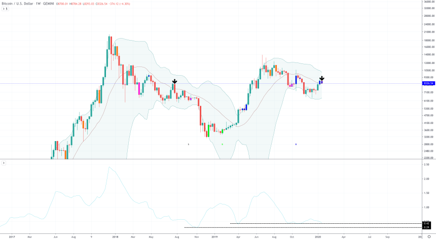 In July 2018, Bitcoin couldn’t hold above the mid-BB line (pictured above) and fell back down, then dropping further through support at $6,000 to reach its ultimate bottom. If Bitcoin cannot hold above the mid-BB line yet again, a repeat of the disastrous drop could be next.