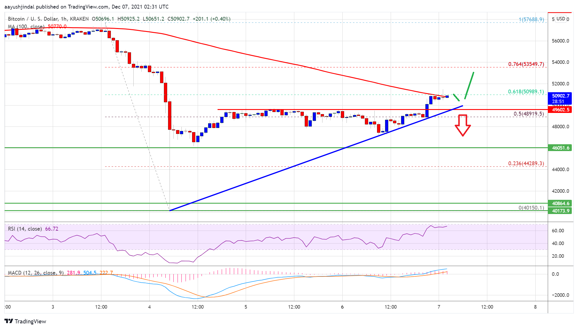 Bitcoin is recovering and trading above $50,000 against the US Dollar. ETH must settle above $51,000 and the 100 hourly SMA to continue higher.