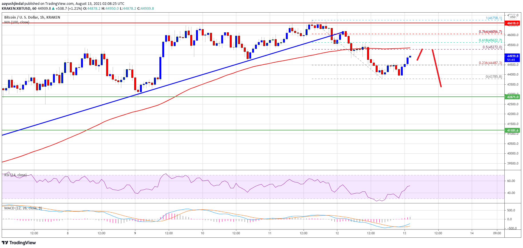 A low was formed near $43,785 and the price is now correcting losses. It recovered above the $44,000 and $44,500 levels. There was a break above the 23.6% Fib retracement level of the recent decline from the $46,758 swing high to $43,785 low.
