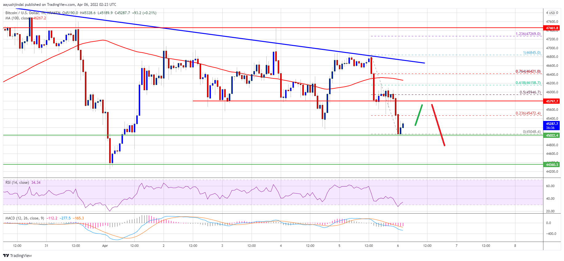 There was a downside break below the $46,000 support level and the 100 hourly simple moving average. The price declined below the $45,500 support to move into a short-term bearish zone. However, the bulls are now defending the $45,000 support zone.