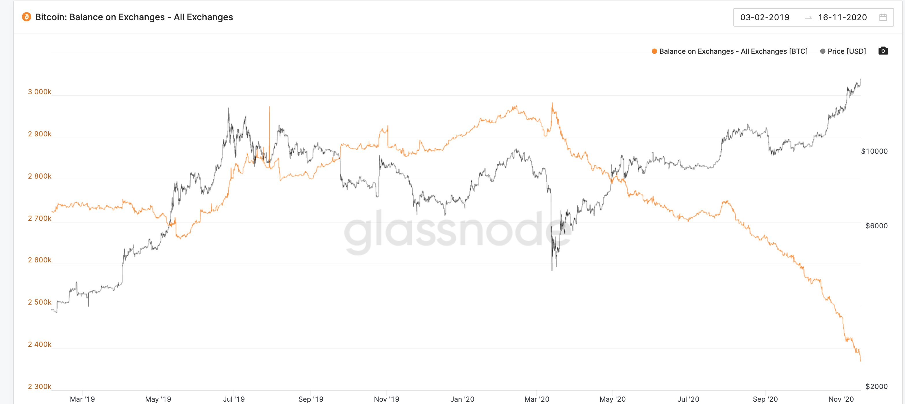 Data fetched by Glassnode, an on-chain analytics firm, shows that the Bitcoin balances on all the cryptocurrency exchanges are declining rapidly against the rising prices.