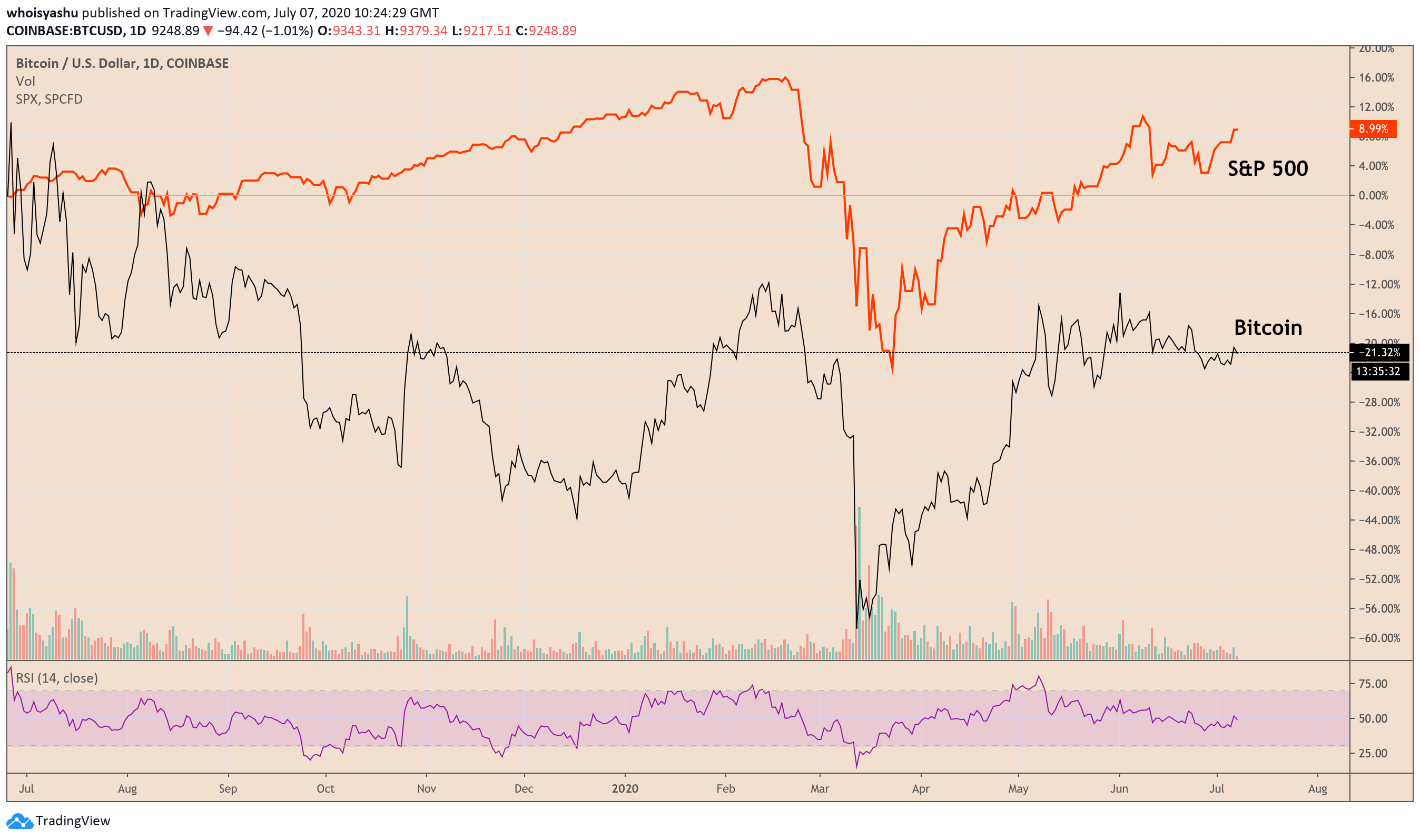 Bitcoin and S&P 500 over the past three months. Source: TradingView.com