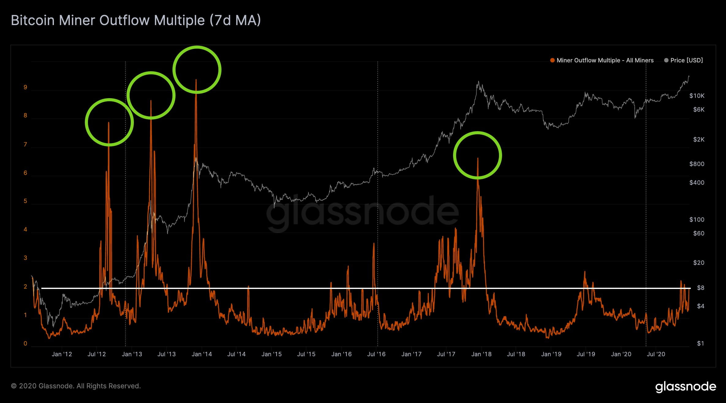 “The Miner Outflow Multiple, which shows when BTC miner outflow is high with respect to its historical average, is far from previous tops and even below the 2019 local top,” commented Glassnode.