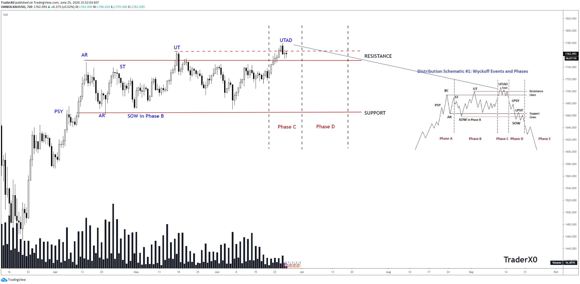 One analyst is noting that he believes gold could currently be forming a clear distribution pattern, with it currently testing a breakout above the upper boundary of its channel.