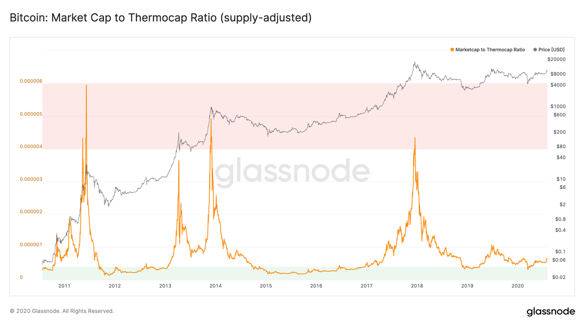 “The Market Cap to Thermocap Ratio indicates if an asset is trading at a premium with respect to the total revenue generated by the network (aggregate security spend). Bitcoin’s current value is still at very low levels – 5-10x away from previous tops.”