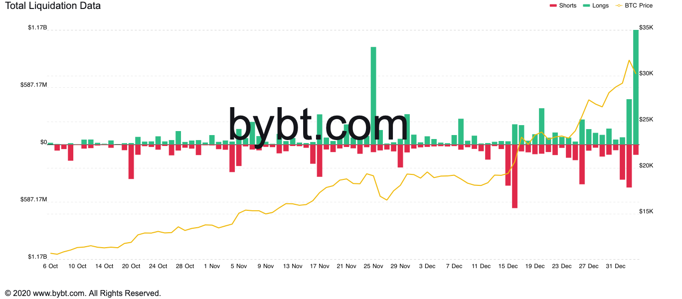 Data provided by ByBt.com shows that the BTC/USD market liquidated long contracts worth $1.17 billion as of 2130 EST Sunday. The stop-losses triggered as the Bitcoin price slumped back below $30,000 amid a corrective spot market move, leaving derivative traders with open short positions in a profitable state.