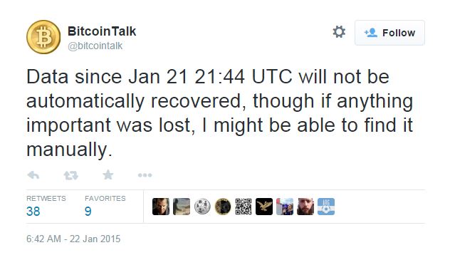 Theymos finally posted an update on the situation hours after users had started complaining about the downtime. As seen in the first update by bitcointalk’s official twitter account, the problem that caused the downtime was the failure of some storage disks. It was later revealed that any post data from approximately 9 hours before the downtime would not be recovered after the restoration.