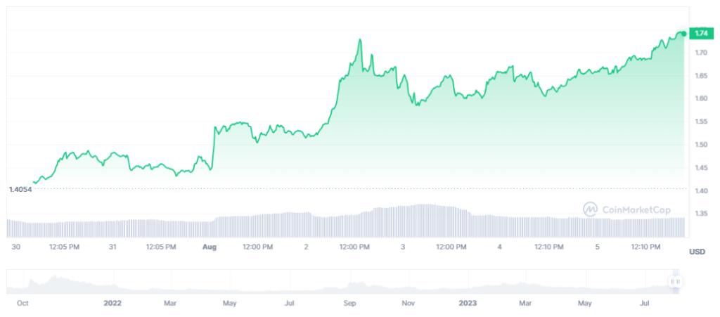 The cryptocurrency market is currently growing in a variety of ways, but the Shiba Inu (SHIB) ecosystem’s tokens are currently noticeably on a positive run. Bone ShibaSwap (BONE), one of the leading tokens in the meme coin ecosystem, is on a clear uptrend, rising as much as 5.6% in the previous day to $1.74. The coin has increased by more than 25% over the last week as a result of the ecosystem’s overall buzz.