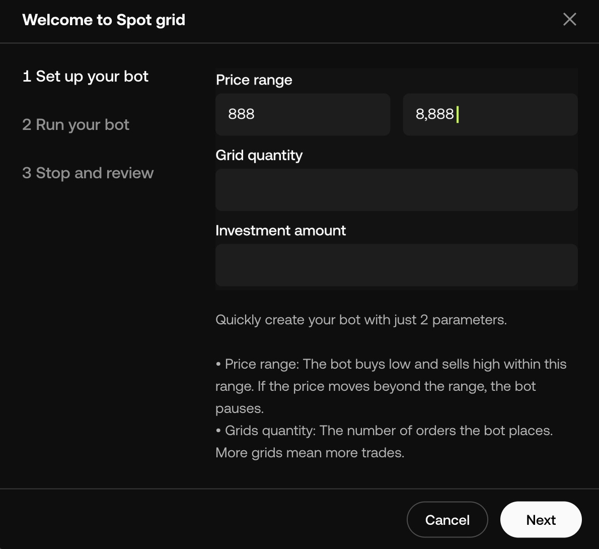Une fois votre bot sélectionné, définissez ses paramètres. Par exemple, pour un Spot Grid Bot, vous devrez régler :