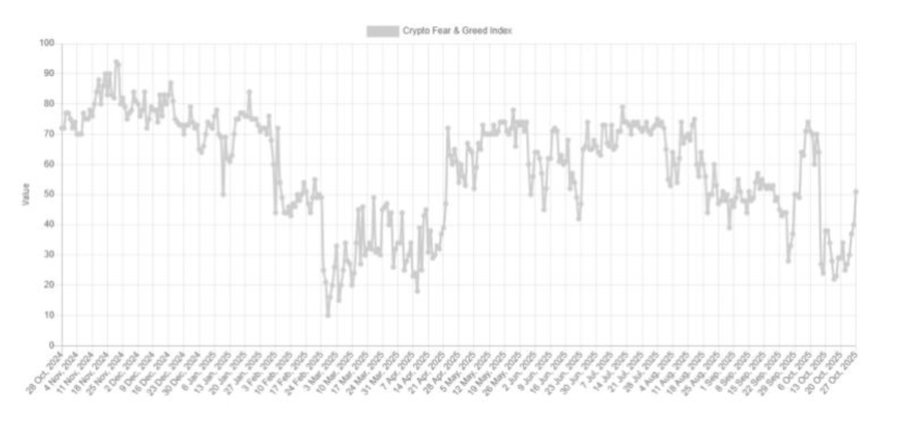 De Bitcoin koers heeft de afgelopen dagen een aanzienlijk herstel doorgemaakt en ligt weer boven de €115.000. Beleggers blijven echter opmerkelijk rustig. De Fear & Greed Index, die de angst en hebzucht van de markt beoordeelt, heeft een neutrale score van 51. Dit houdt in dat er momenteel geen angst of euforie is, terwijl de koers zich dicht bij een cruciaal hoogtepunt bevindt.