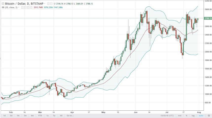 Bitcoin fell initially on Monday but found enough support underneath the turn around and form a hammer like candle as I record this video. It looks as if we are going to try to break above the $2800 level, and then eventually go looking towards $2900. Pullbacks on short-term charts should continue to offer value the traders are willing to take advantage of.