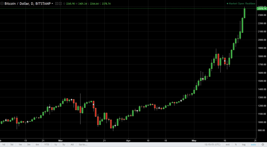 Bitcoin rally during the day again on Wednesday, as we have broken towards the 2400 level. A pullback from here should continue to see buyers, and therefore a “buy on the dips” situation remains, and it now looks as if the market may be aiming for the $2500 level. We are overbought by just about any metric you can measure it by, so pullbacks are likely. Pullbacks should offer value though.