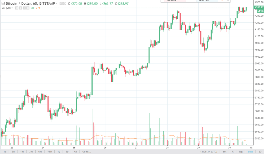 Bitcoin rally during the day on Friday, reaching above the $4200 level. By doing so, we went into the weekend showing real strength. It looks now as if the buyers are coming back on dips, and therefore this is a market that seems to be well supported at the $4200 level, and again extending down to $4000.