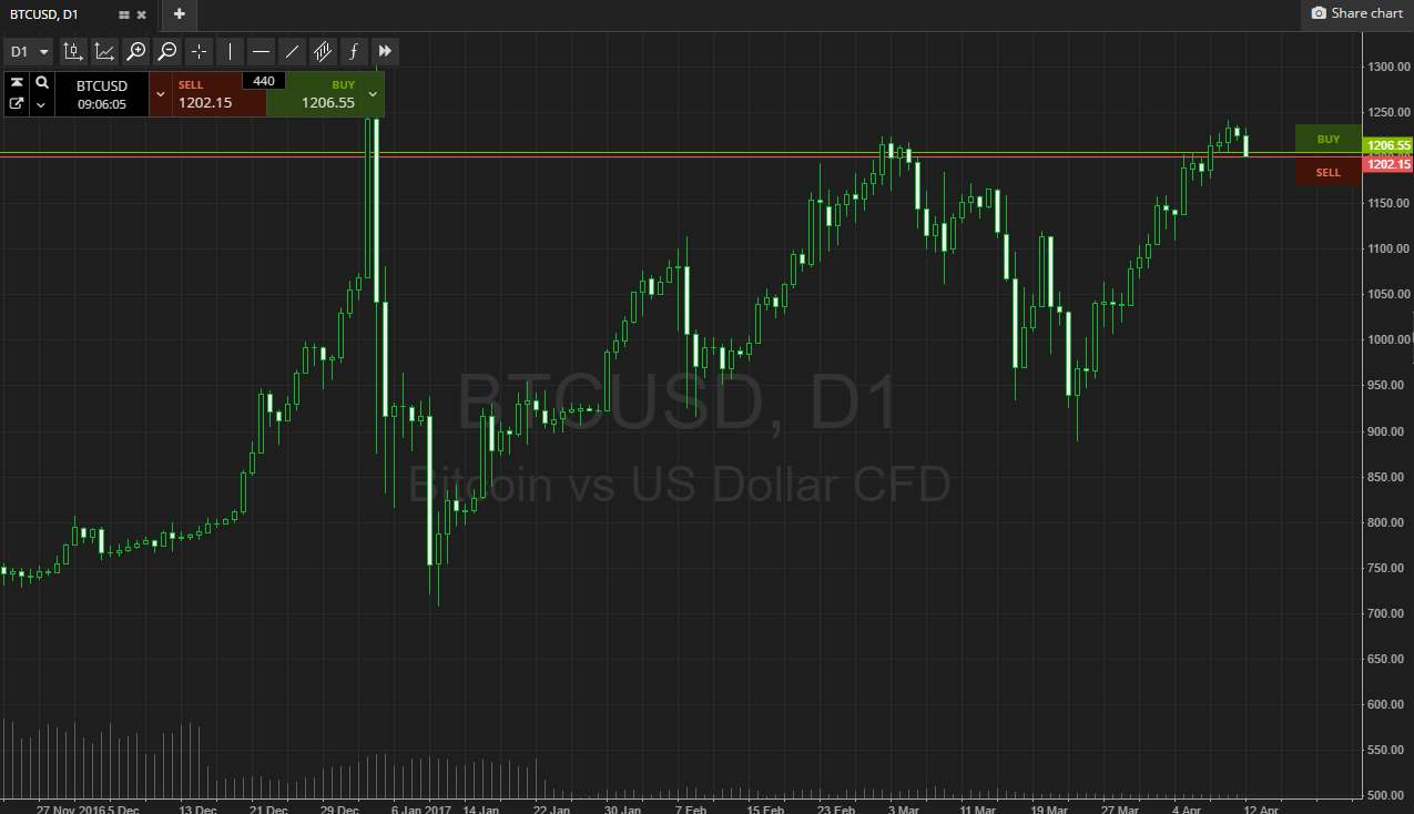 The Bitcoin market was slightly negative on Thursday, as we continue to hover near the $1200 level. Currently, looks as if the market is taking a bit of a breather after the massive move higher, and this of course is typical of a market that is looking for its legs. Short-term pullback should find plenty of support near this level, and a break above the $1250 level should send the market higher and reaching towards the $1300.
