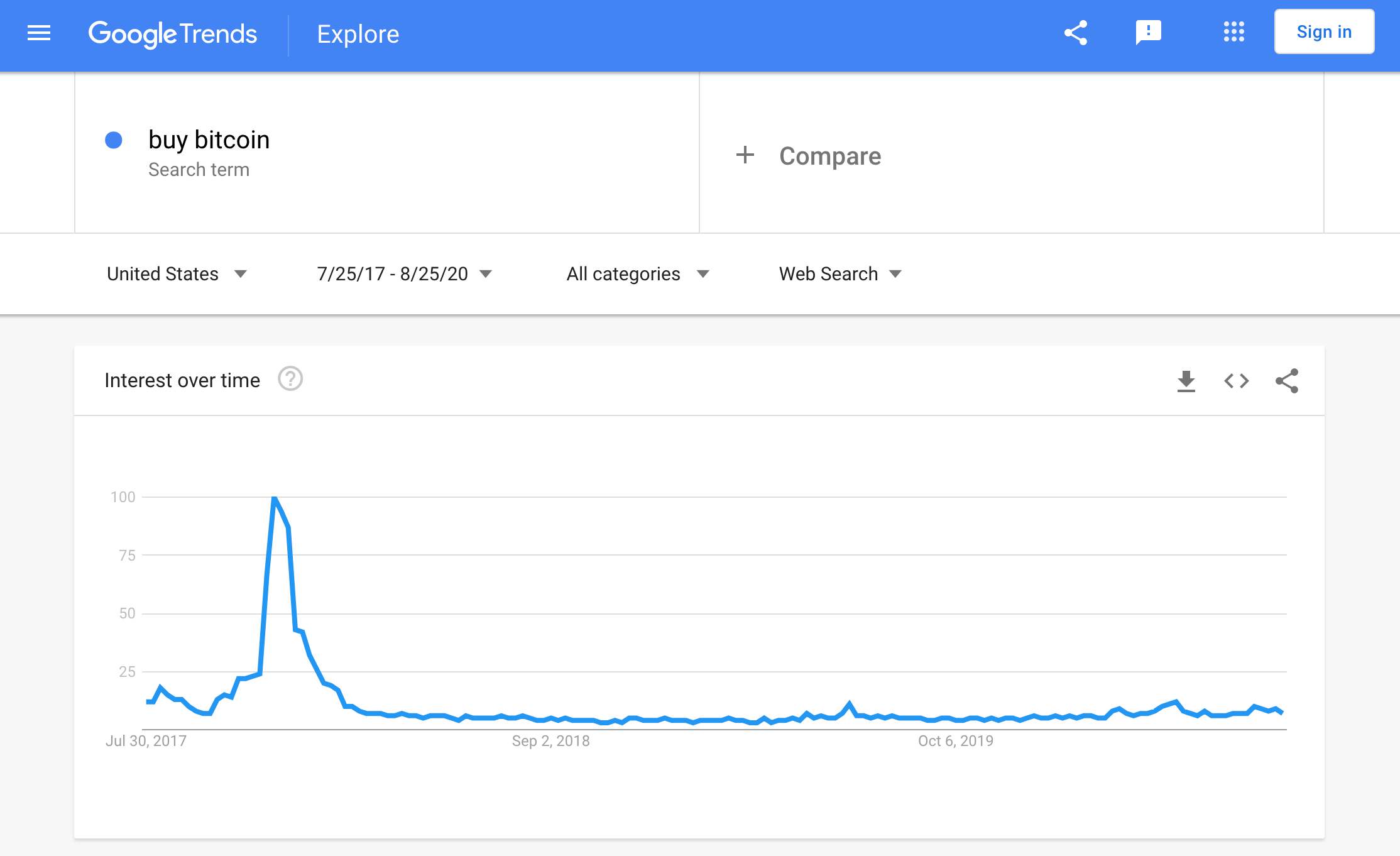 The massive burst in queries from FOMO-driven searches scrambling to “buy Bitcoin” in 2017 can be seen in the Google Trends chart below. In early 2020, just as Bitcoin rose above $10,000, the metric saw another small peak. But it was nothing compared to the surge at the peak crypto bubble exuberance.